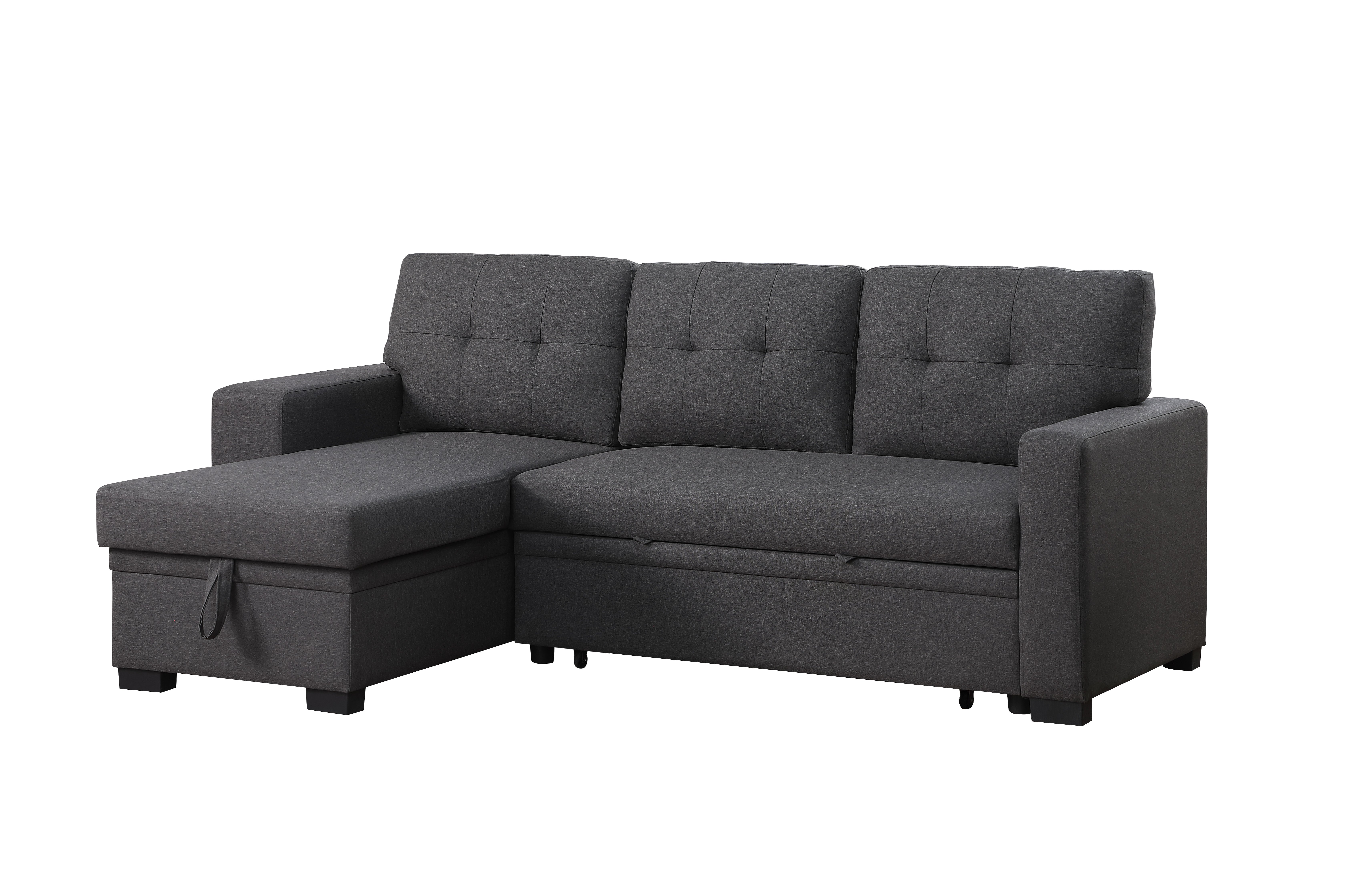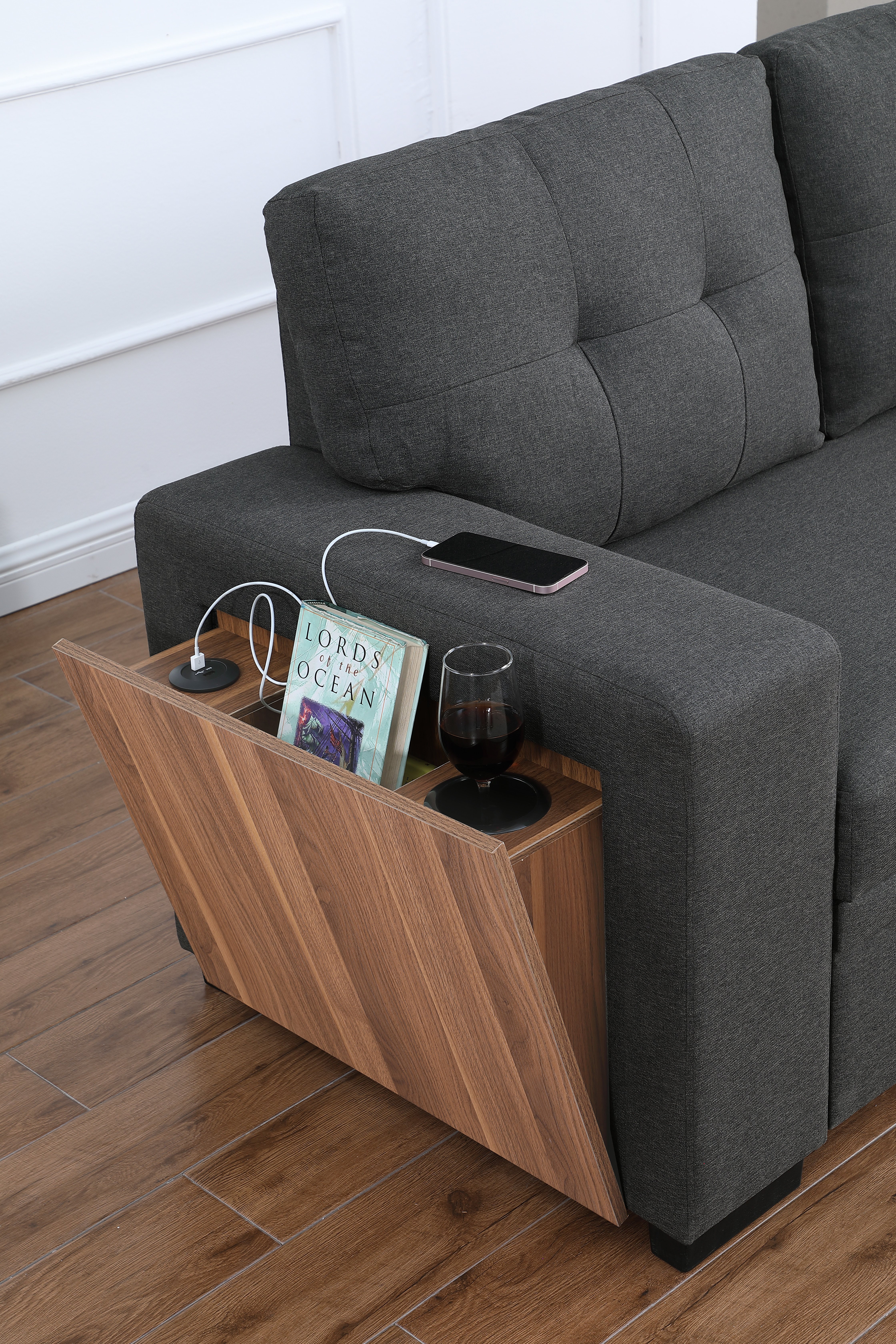 This choice adds a touch of modernity and sophistication, enhancing the overall visual appeal of the piece. In summary, this pull-out sectional sofa with its linen blend material, chaise with storage, pull-out loveseat with a side open cup holder, removable back cushions, and black leg color is a versatile and stylish addition to any living space, providing comfort, convenience