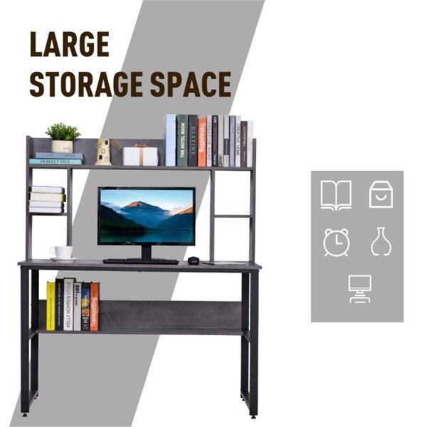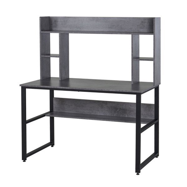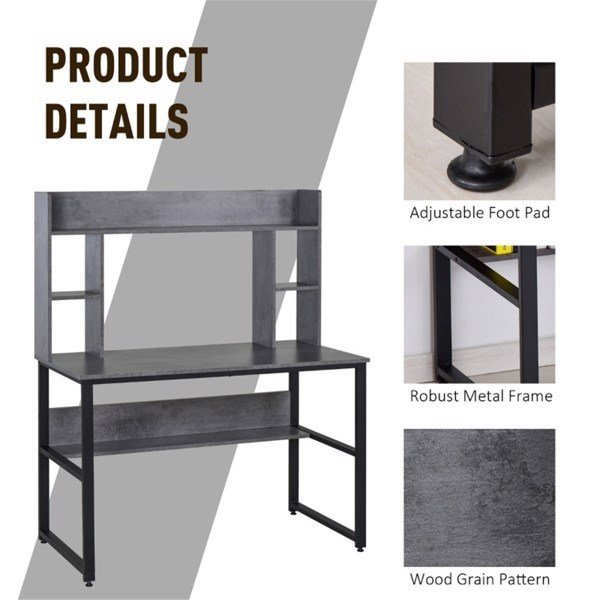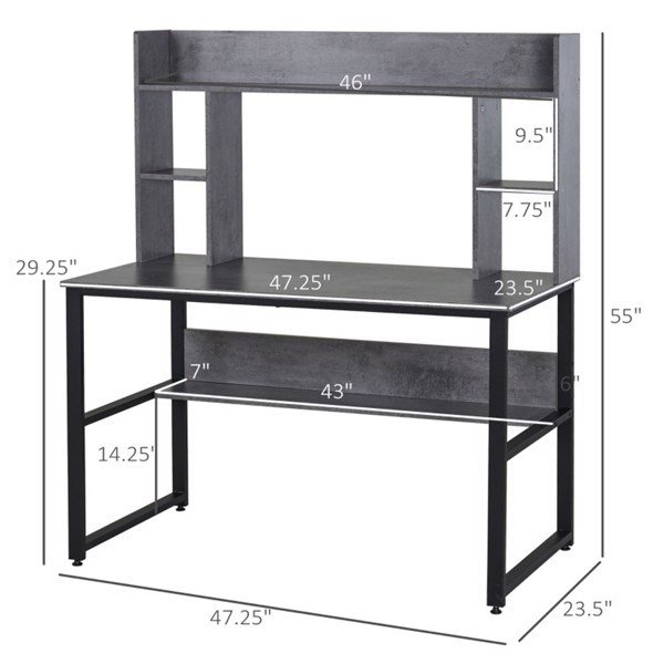 Features:- Woodgrain pattern adds a sleek touch to any office or home space- Features several shelves, offer large storage space for your laptop, books and other office essentials- Made from particleboard and steel for sturdiness- The anti-scratched melamine treated desktop, easy to clean- Adjustable foot pads keep these home office desks stable even on the uneven floor- Easy assembly is requiredSpecification:- Color: Grey, Black- Material: Particleboard, Steel- Max Load: 66 lbs (Desktop), 11 lbs (Shelf)- Overall Dimension: 47.25" L x 23.5" W x 55" H- Desktop Dimension: 47.25" L x 23.5" W x 29.25" H- Under Desktop Shelf Dimension: 43"L x 7"W x 6"H- Top Shelf Dimension: 46"L x 7"W x 6"H